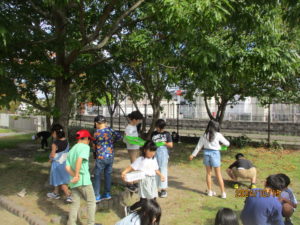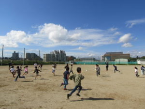 最初に校庭で、たて割りグループ「いちなじブラザーズ」対抗のしっぽとりを行いました。
