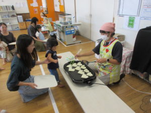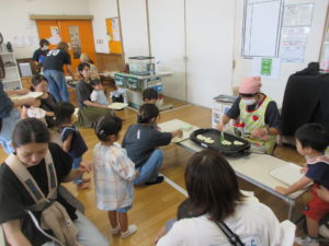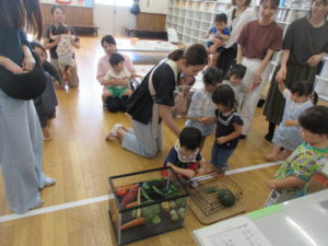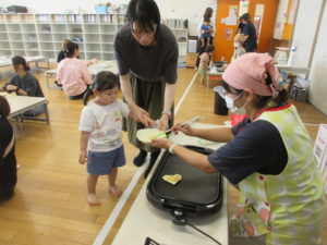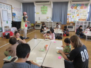 多賀城市子ども家庭課親子保健係の管理栄養士の方々にきていただき、「デザートはるまきを作ろう」や「野菜の実験」を実施しました。
