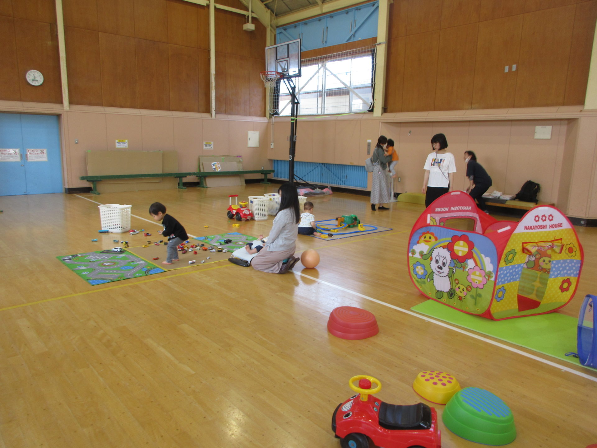 乳幼児親子が来館しホールで乗り物玩具や木の玩具などでたくさん遊びました。