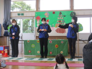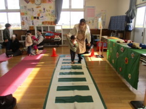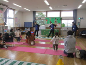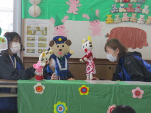体操をしたり、人形劇を観ながら親子で楽しく交通安全を学ぶことができました。