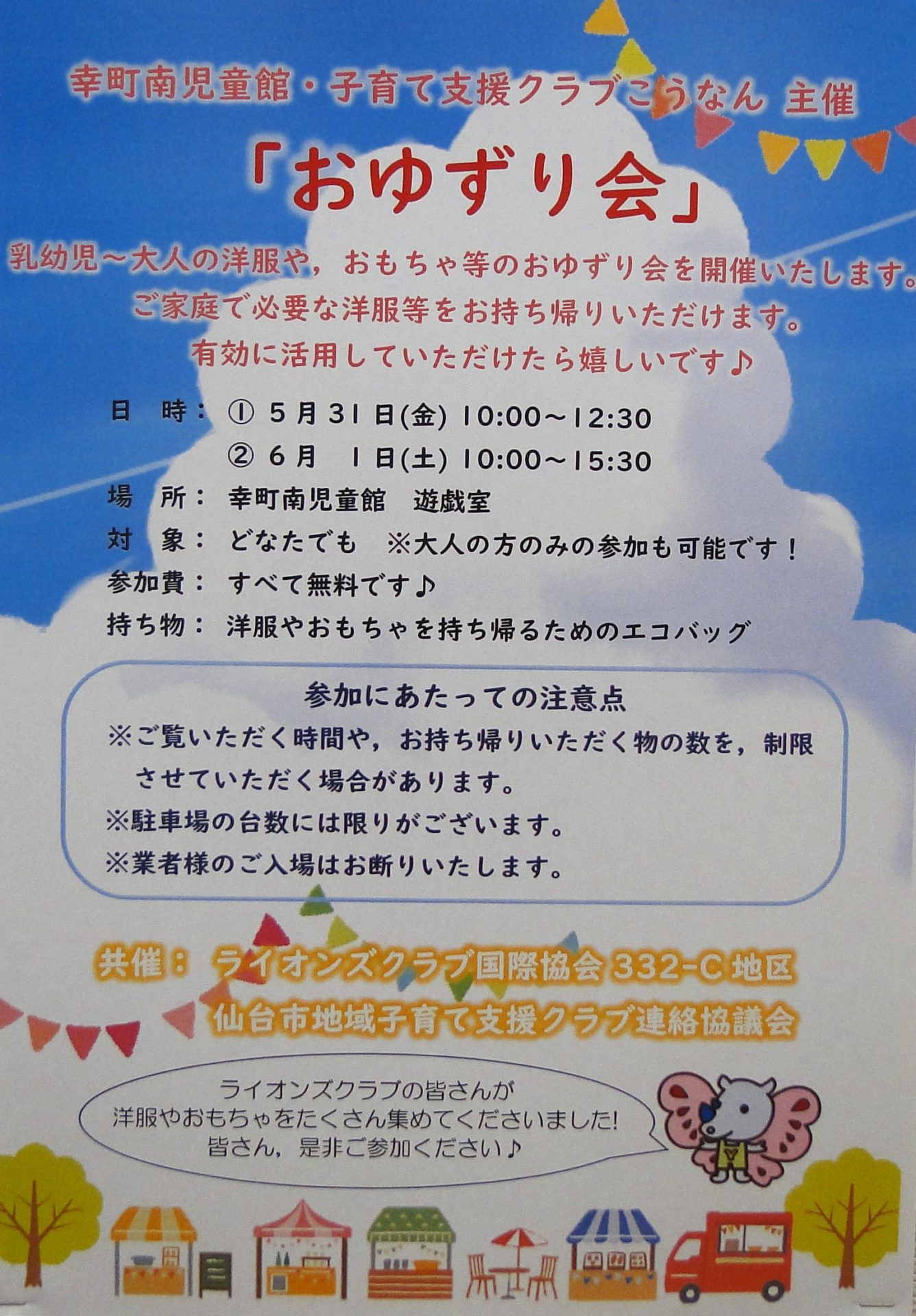 子育て支援クラブ「こうなん」さんとライオンズクラブさん,仙台市地域子育て支援クラブさんのご協力をいただきまして,5月31日(金)と6月1日(土)の二日間おゆずり会を開催いたします。どなたでもご参加できます。参加費は無料になっております。是非この機会に幸町南児童館へお越しください♫