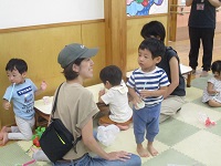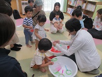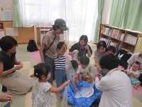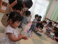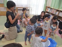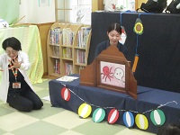 夏にぴったりのお話「くだものだもの」(絵本),「うみのおまつり」(紙芝居)等の読み聞かせを行った後に,工作を行った。