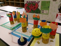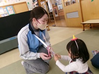 ①「おにぎりパクッ」(絵本),②「おにぎりつくろう」(紙芝居),③「のりまき」(絵本),④「おにぎりなっぱ」(紙芝居)の読み聞かせの後に,節分の工作「おにたいじボーリング」を行いました。