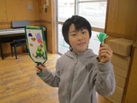 牛乳パックを利用した「羽子板作り」に小学生30名が参加しました。