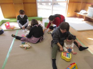 子どもたちはママのそばでつきやまさんと一緒に遊び、ママ達はかわいい小物作りに集中します。