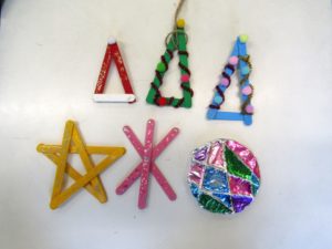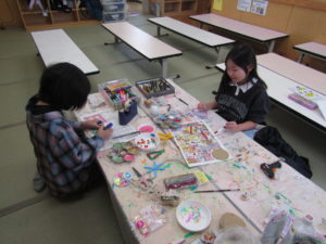 木製のスティックに絵の具で好きな色を塗ってもらい、ラメやモールで飾りをつけてもらいました。