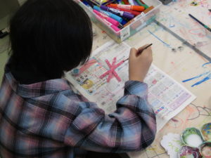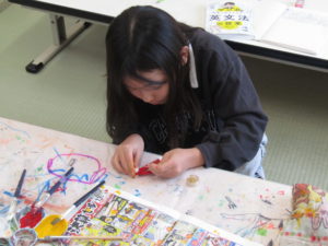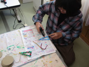 丸く切ったダンボールにタコ糸を巻いて、アルミホイルをつけてから油性ペンで好きな色に塗ったものも作ってもらいました。