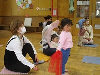 手遊びや「おへんじ、はーい」「らららぞうきん」,その後は「さんぽ」の曲に合わせて歩いて踊りました。