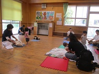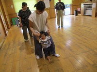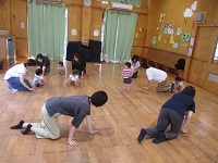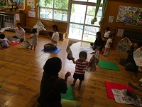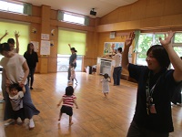 乳幼児親子8組の参加があり,「さんぽ」の曲で円になり,手足を動かしたり,ジャンプをしたり,幼児さんたちが元気に動き,喜んでいる様子が見られました。