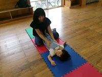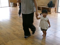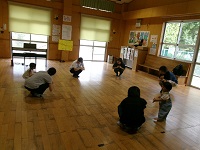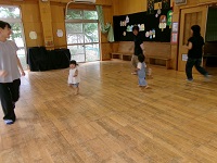親子で手遊びをした後,「森の音楽家」の曲に合わせて,①歩く,②走る,③スキップをすることを楽しみました。