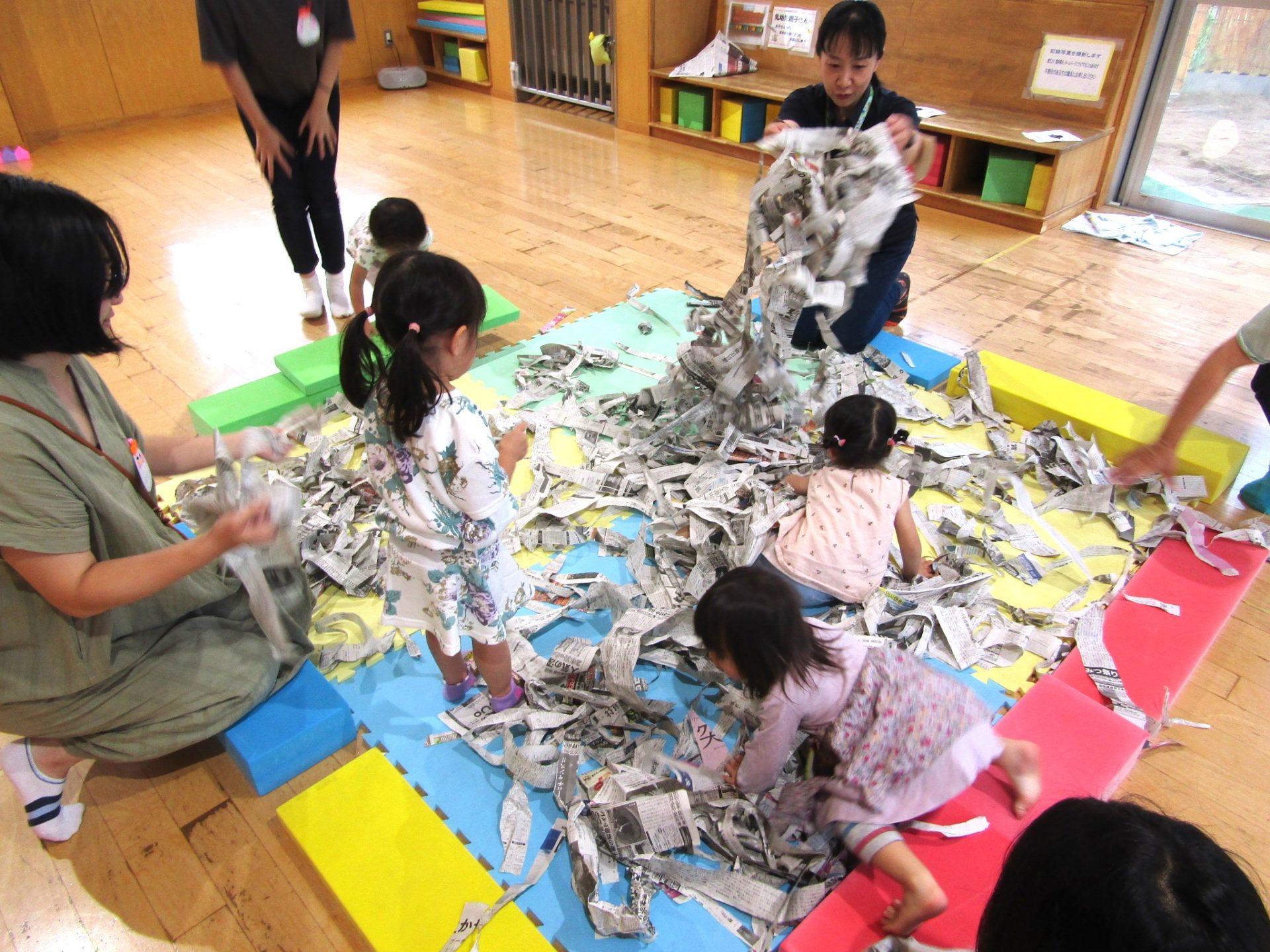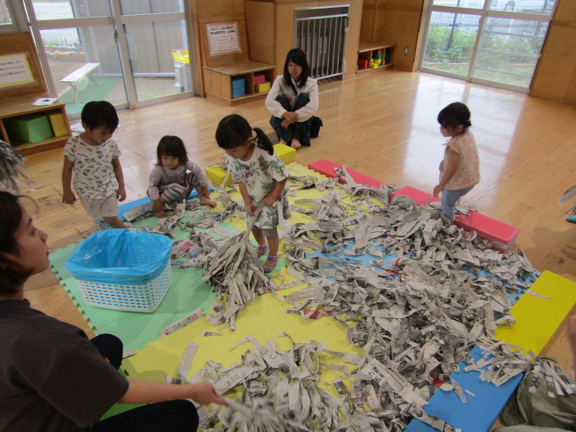 今日は、おもいっきり新聞をビリビリして遊びました。