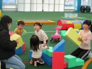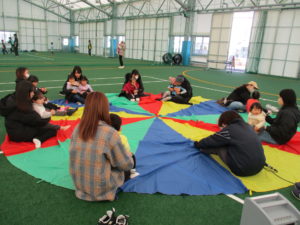 始めにみんなで体操をしてから、乳幼児親子はパラバルーンやソフトブロック、トランポリンをして楽しみました。
