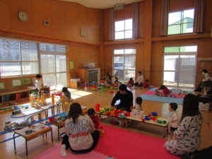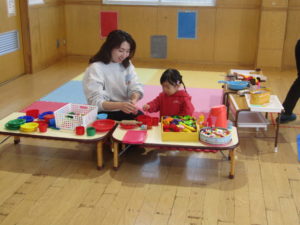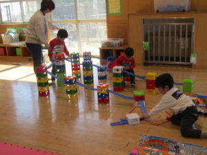 前日に小学生が準備してくれたプラレールやトミカのコース、おままごとでおうちのひとと楽しく遊んでいました。