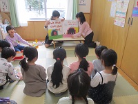 写真は,①6年生の紙芝居の読み聞かせ,②遊戯室の朝の会,③サテライト開設式,④1年生のオリエンテーション,⑤館周りで食べたお弁当の様子です。