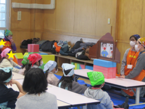 食育紙芝居「お豆の気持ち」で味噌作りについて学びました。