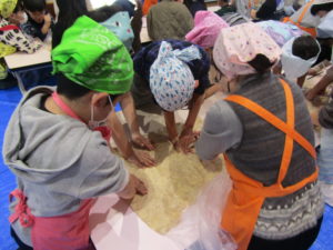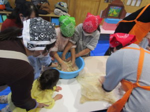 本日、子育て支援クラブぷりん主催「手作り味噌づくり」を行いました。