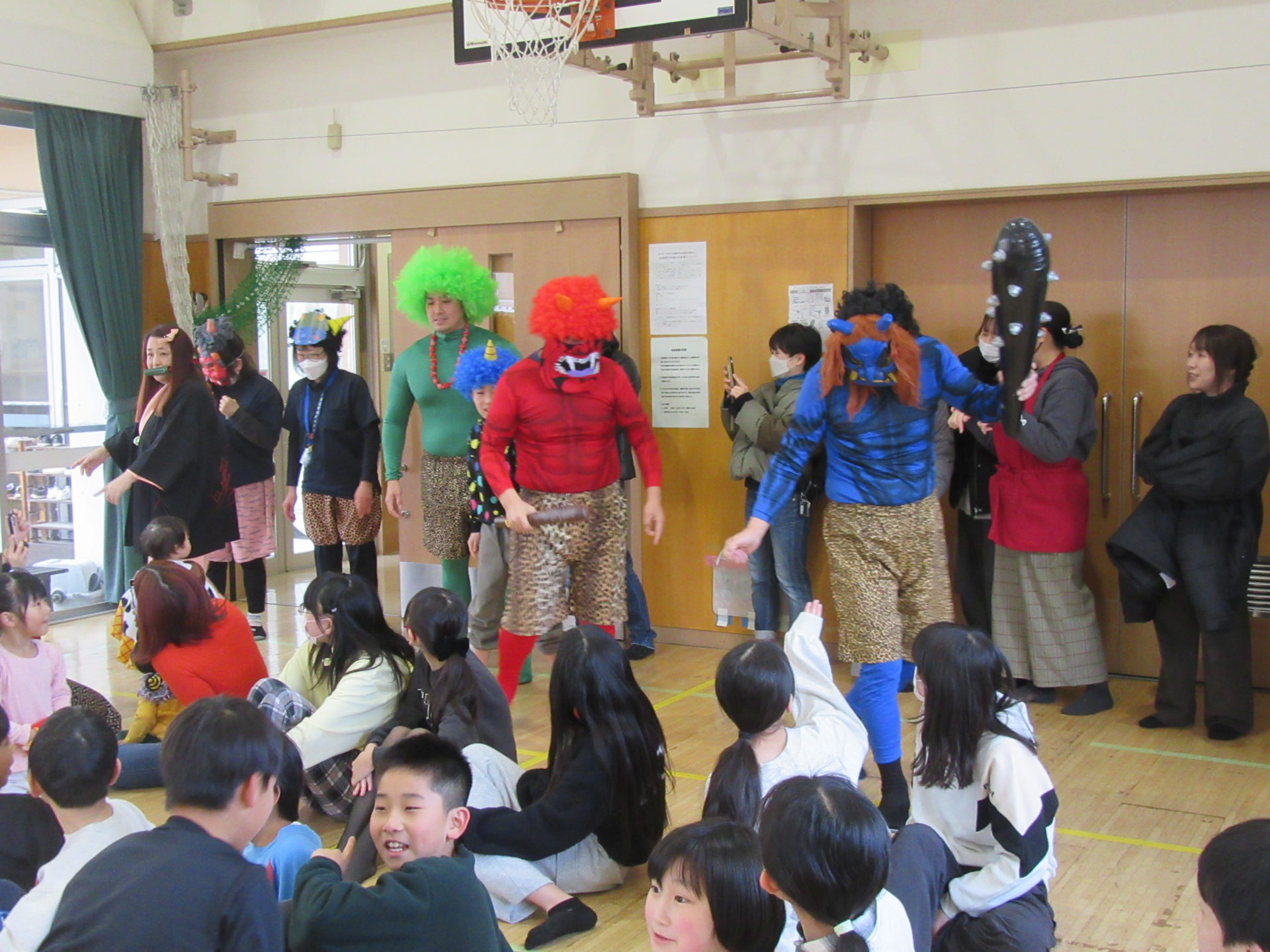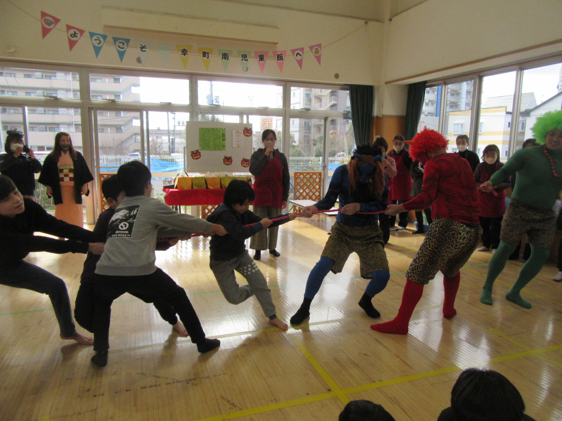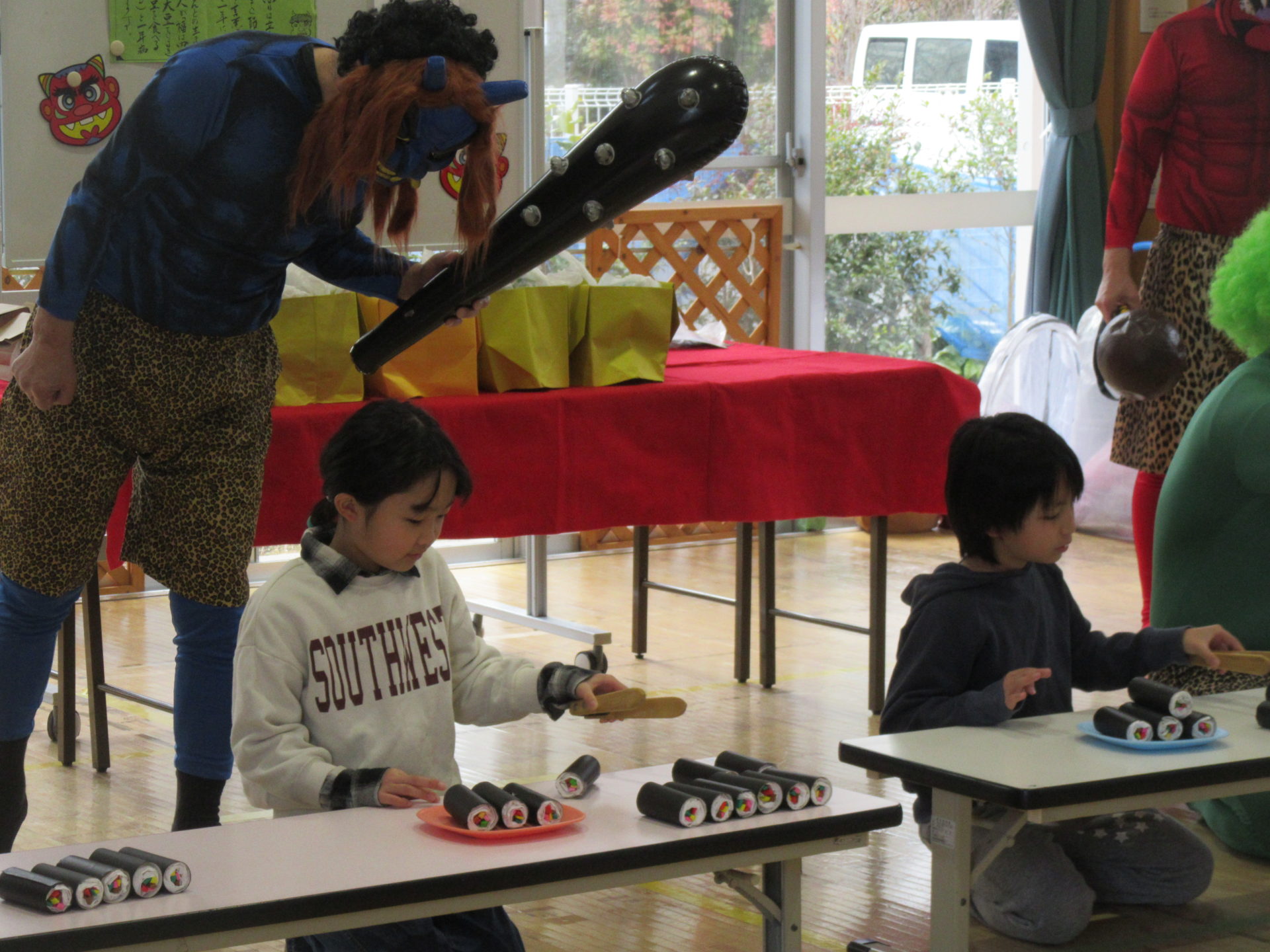 6体の鬼たちと,恵方巻積み競争や綱引きなどのゲームを楽しみました♬