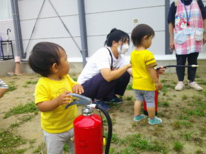 避難訓練で水消火器体験
