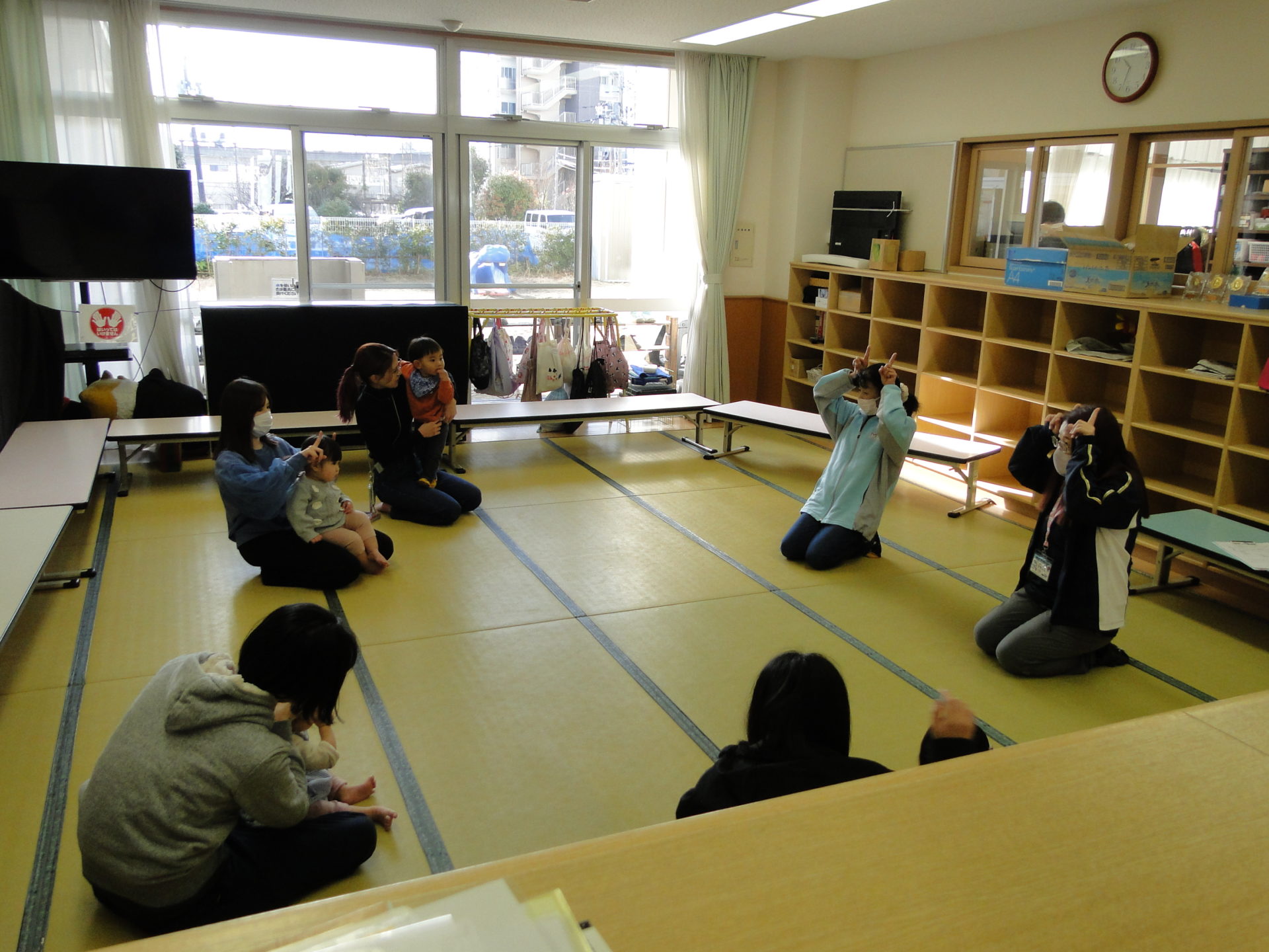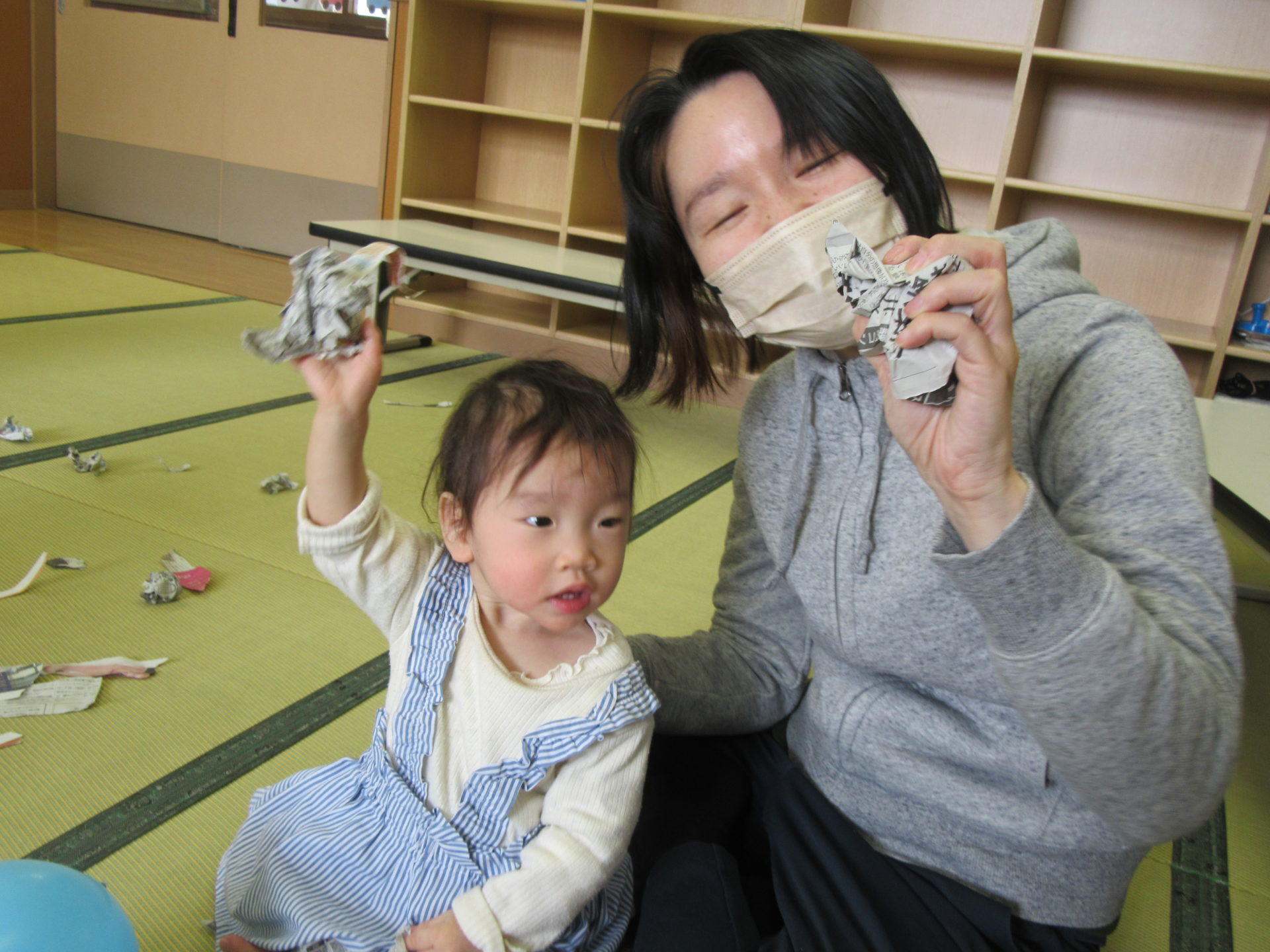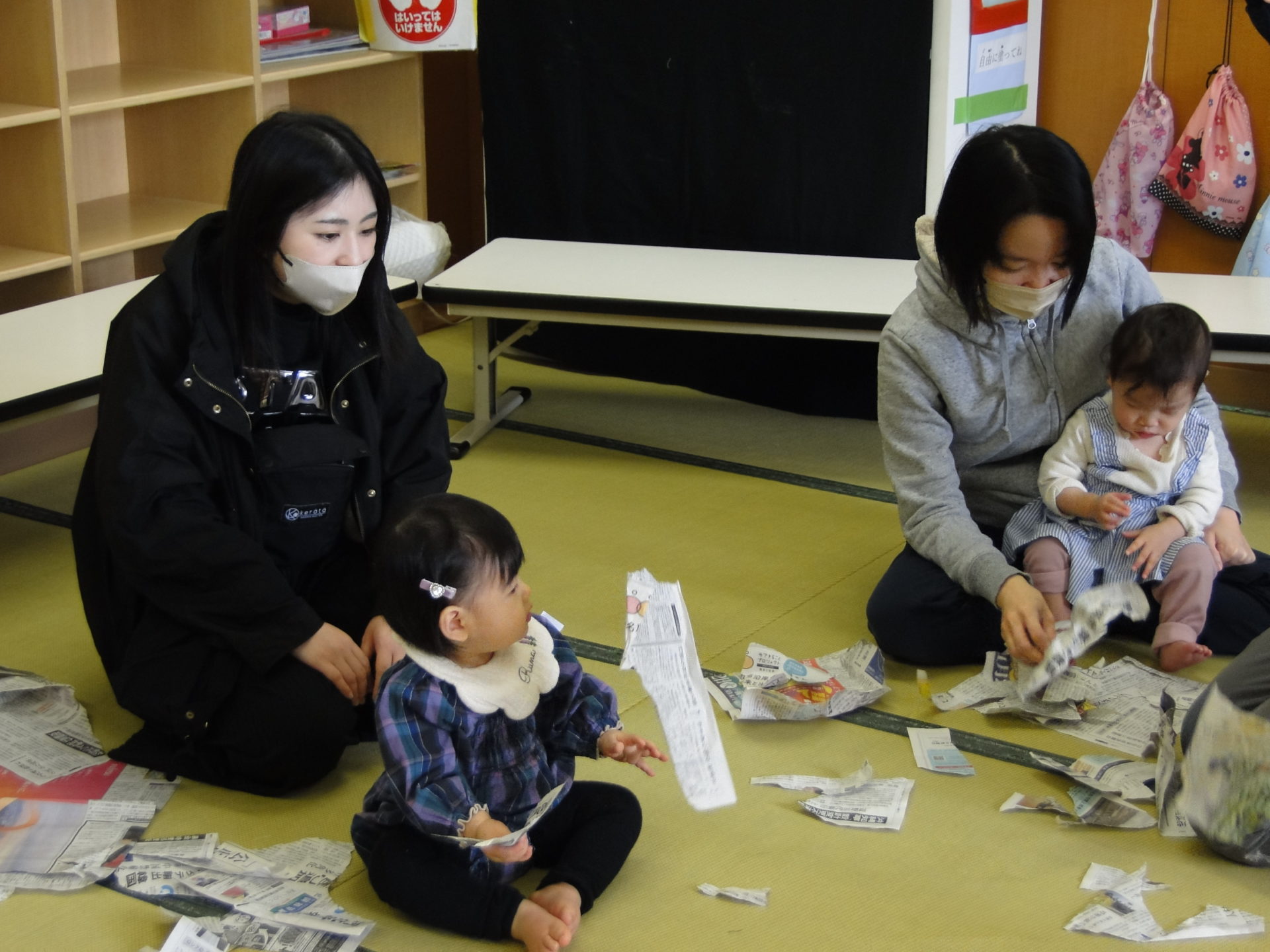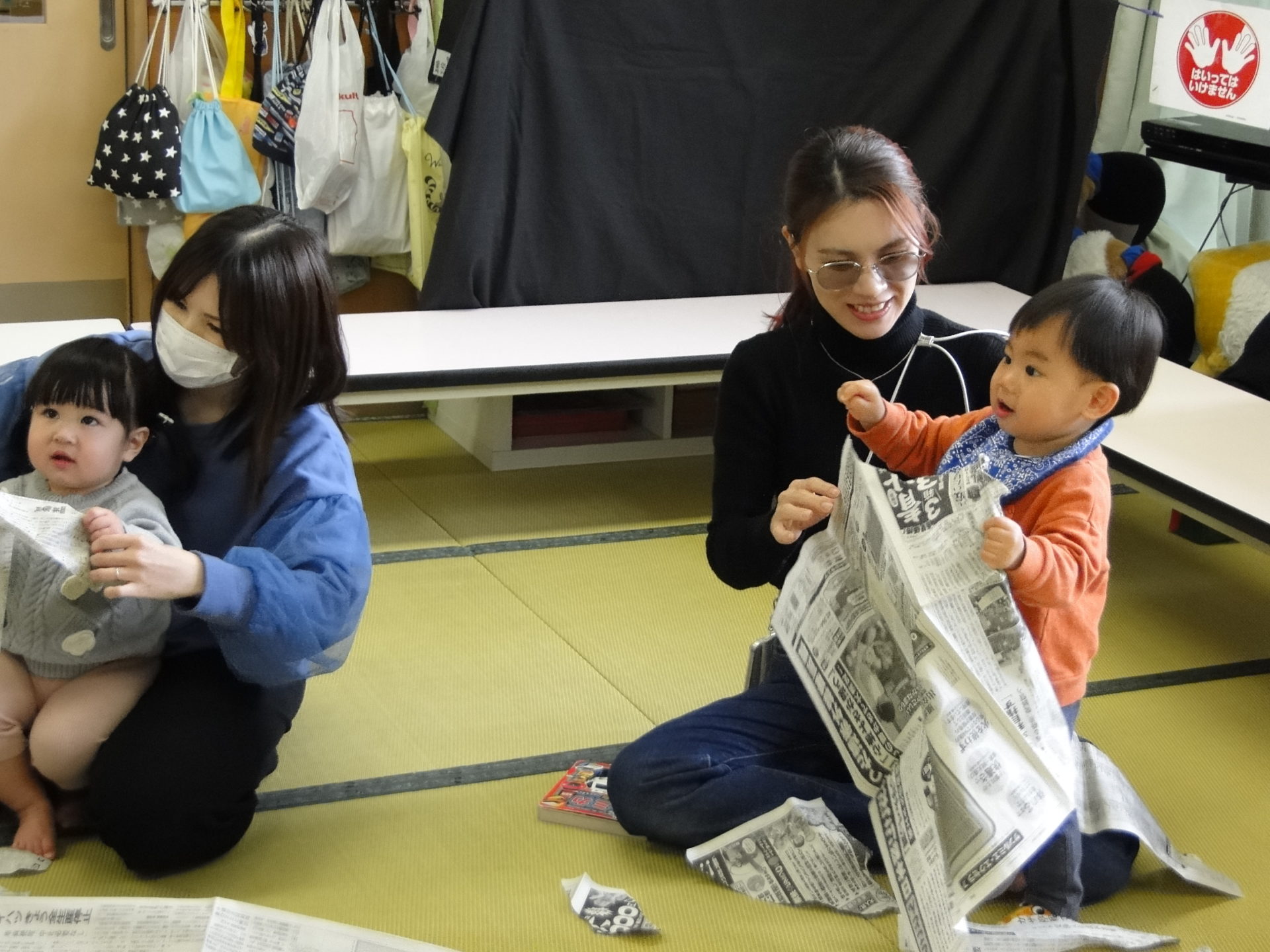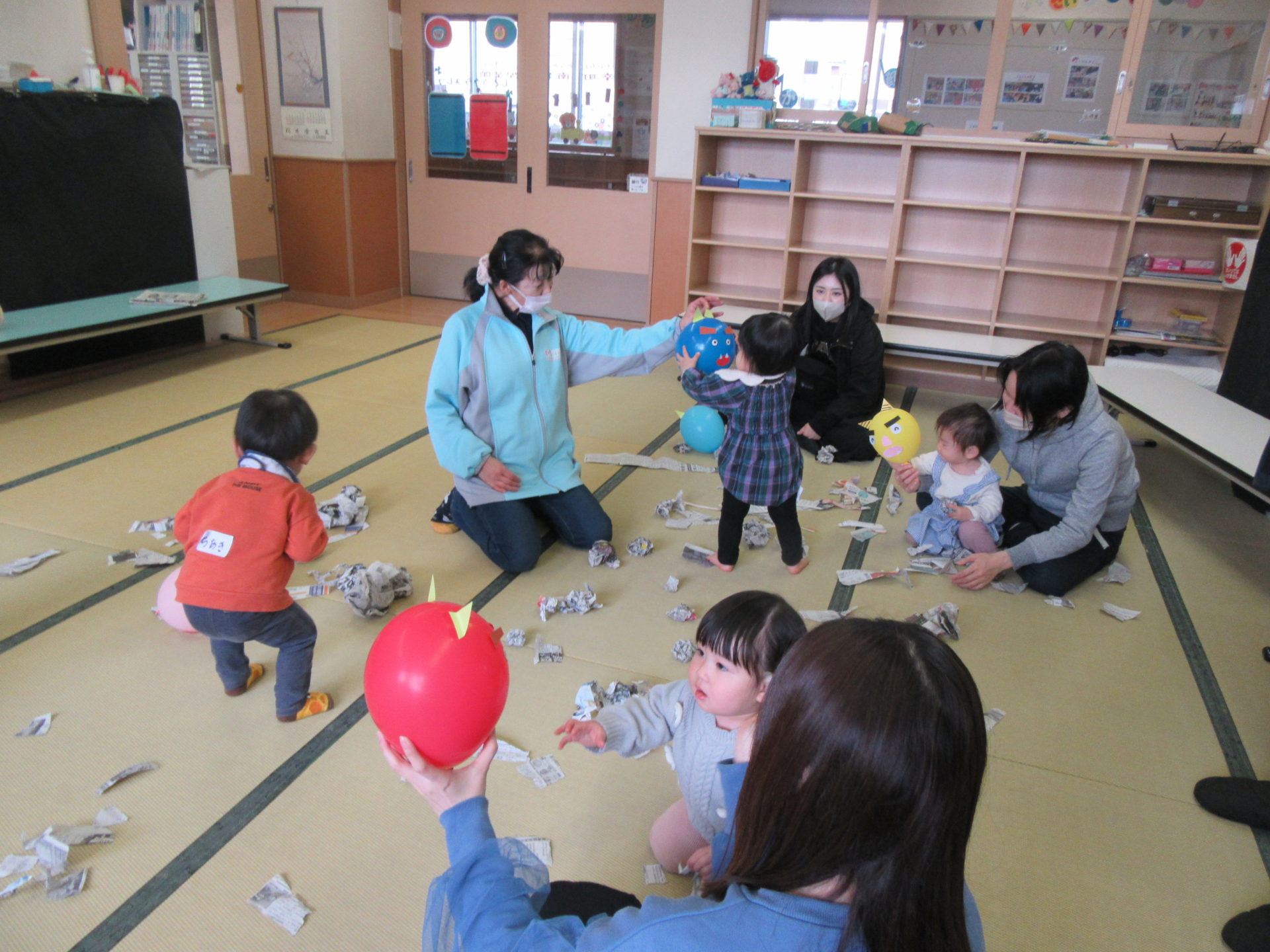 1月14日㈬に新聞紙で遊ぼうの行事がありました🎶鬼のパンツの手遊びをしたあとに,新聞紙シアターを見たり,新聞紙をちぎって花吹雪にしたりしました。そのあとは丸めて風船の鬼に投げて退治しました♬