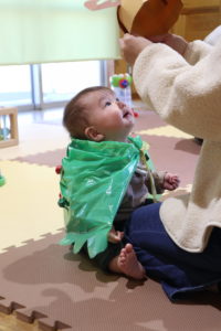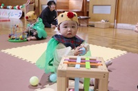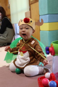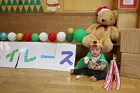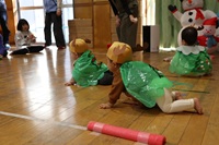 クリスマスをテーマに衣装のトナカイの帽子やツリーのマントを身に付けてハイハイレースを行ったので,保護者の方も喜んでくださった。