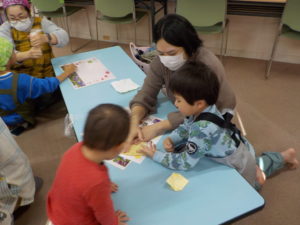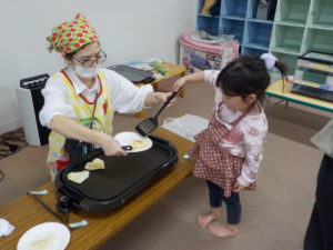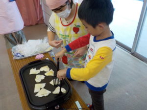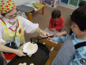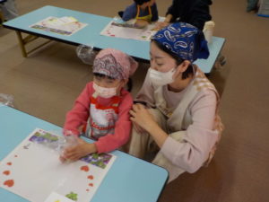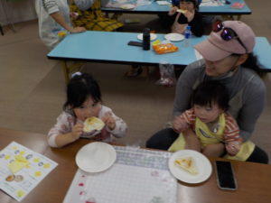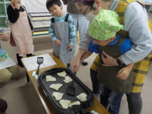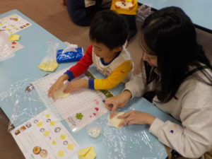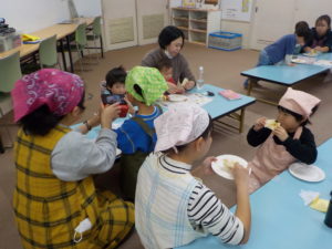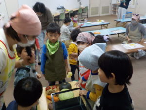 多賀城市子ども家庭課さんと一緒に「やさいとおともだちなろう!」と、親子でハート型のおやつ春巻きづくりと野菜の浮き沈み実験を行いました。