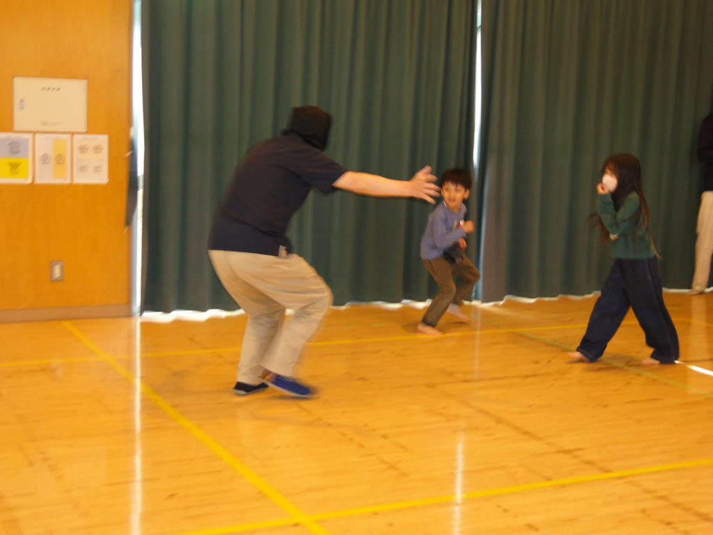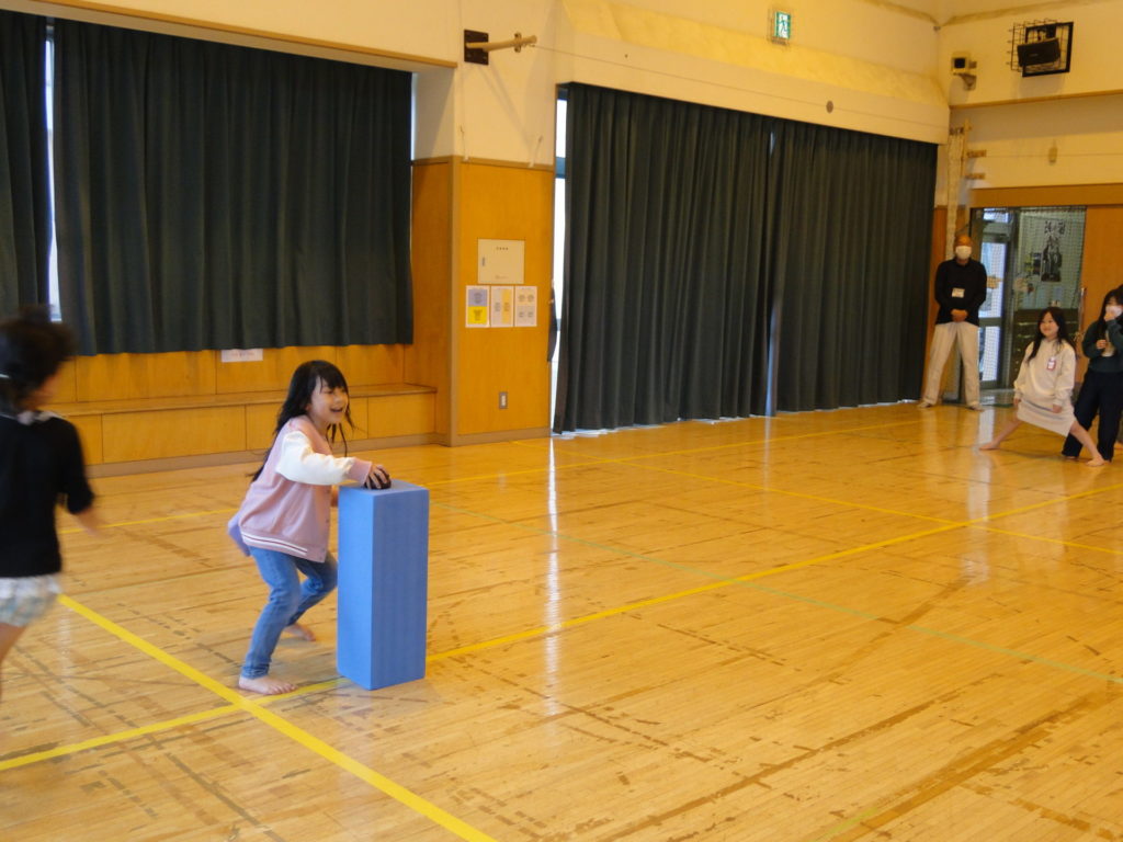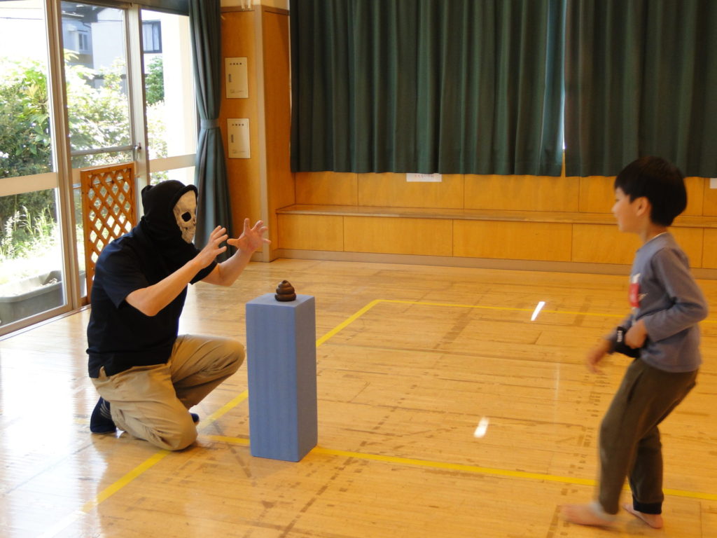 ソフトブックの上に置かれた宝物を,がいこつマンの攻撃をかわしながら奪うゲームです。初めて参加する1年生の子供たちは,写真で見た「がいこつマン」に逢いたくてとても楽しみしていてくれました。みんなと協力して宝物をゲットすることができた子供たち,残念ながらがいこつマンに捕まってしまって残念がる子供たち,いろいろな表情を見せてくれました♬