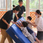 マベリンが作ったお城 それを真似する子供たち 真似をするって,結構むずかしいんだよね。 でも上手!! こちらも職員と何か作ってる ピラミットだ!! 押してるの…? すごい! ピラミットが3つになっちゃった!…