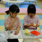 今月の運動遊びは大きなビーチボールを使った運動遊びでした。みんなで協力してビーチボールを床に落ちないようにつなぎました。そのうちに子供たちから「これで試合をしたい」という声が上がり,5点5セットマッチを行いました。自由来…